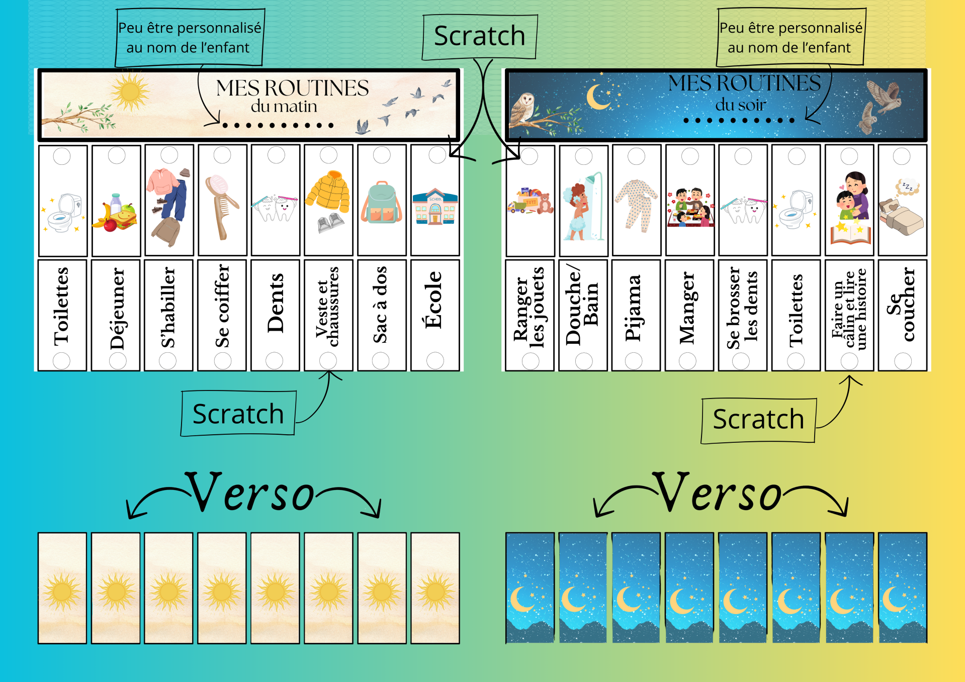 Chaque création est entièrement personnalisable avec le prénom de votre enfant et ses rituels quotidiens . Si vous souhaitez apporter des modifications , il vous suffira de me le signaler , et j'adapterai la création en fonction de vos besoins .
