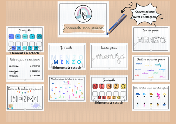 Le livret est entièrement personnalisé avec le prénom de votre choix . Votre enfant va pouvoir explorer son prénom sous différentes formes, mais surtout jouer avec la reconnaissance visuelle, le placement des vignettes, mais aussi l'initiation. Et plus encore . Ce livret d'activités, je découvre mon prénom et en format paysage A4. Et comme vous allez pouvoir le constater, nos supports sont effaçables donc réutilisable à volonté, en plus du scratch repositionnable.